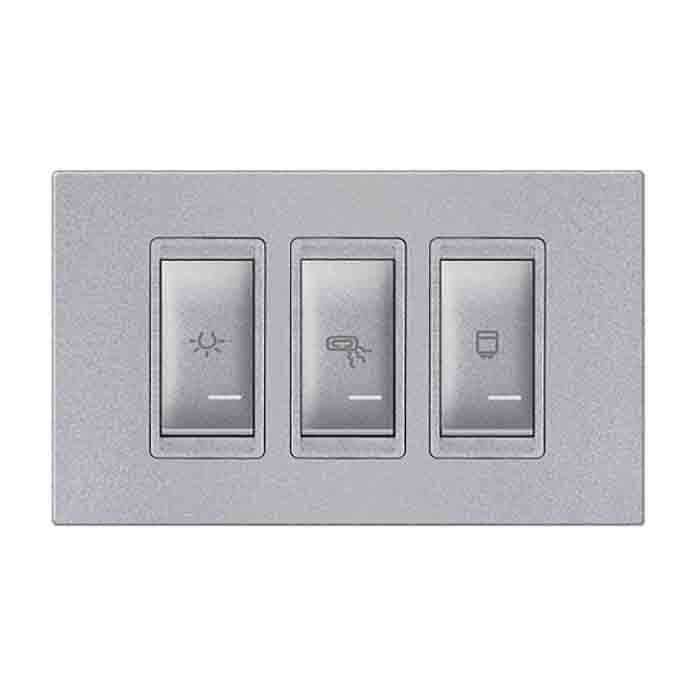 Horizontalni set sklopki sa indikacijom omogućava upravljanje sa tri nezavisna kruga sa jasno označenim funkcijama: svetlo, grejalica i bojler. Elegantna srebrna boja doprinosi savremenom izgledu prostora.