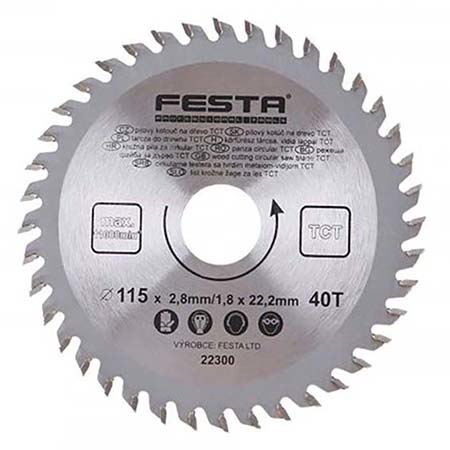 Kružna testera sa vidijom FESTA namenjena za sečenje drveta, prečnika 115 mm, debljine 2.8 mm i prihvata 22.2 mm, sa 40 zuba, šifra 22300. Telo diska izrađeno je od visokokvalitetnog ugljeničnog čelika sa tvrdoćom HRC 40, što obezbeđuje stabilnost, otpornost na deformacije i dug vek trajanja.